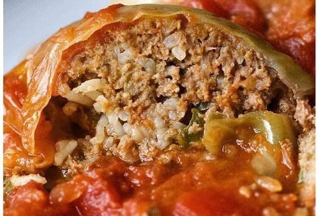 Pour half the sauce in the bottom of the prepared baking dish. Transfer the cabbage rolls, seam side down, on top of the sauce. Pour remaining sauce over the cabbage rolls.