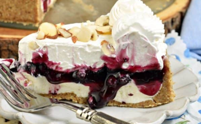 No Bake Blueberry Cheesecake recipe with almonds and a graham cracker crust. An easy dessert idea for summer, or any holiday!