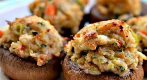 Lade about11/2 soupspoons of filling into each mushroom. Singe for 20 twinkles.