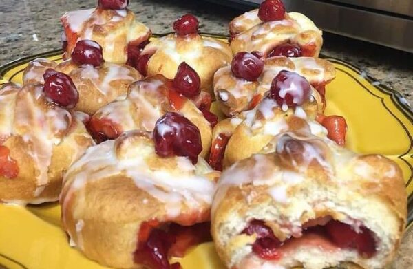 Scoop pie filling into each crescent roll dough piece. Be generous with the pie filling. It’s okay if a little seeps out during baking. A good 3 to 4 heaping tablespoons should work.