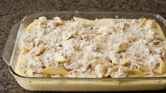 - Arrange apple mixture evenly over cake batter and sprinkle with Topping.