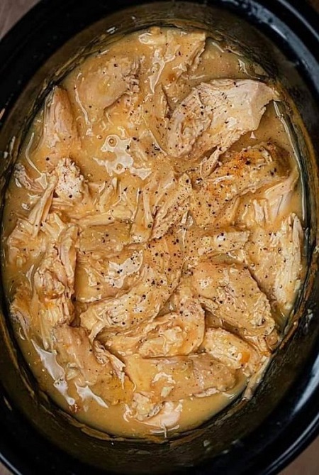 - Pour the prepared gravy mixture over the seasoned chicken in the slow cooker, ensuring even coverage.